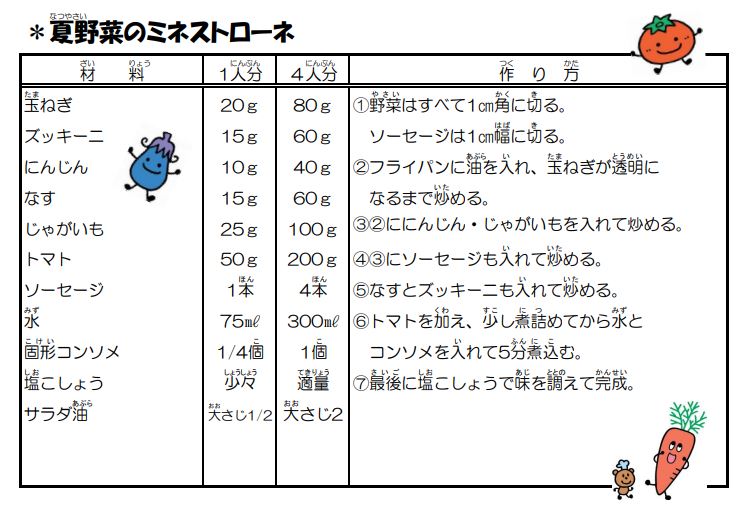 梅雨が明けると厳しい暑さも本格化し、暑さにより食欲が低下してしまう方もいるのではないでしょうか。「だるい」「なんとなくやる気がおきない」「食欲がわかない」「休んでも疲れがとれない…」などの症状がでたら要注意です。暑い夏を元気に乗り切るための食生活のポイント、レシピを参考にみんなで夏バテに負けない体づくりをしましょう。
